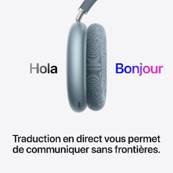 2. La Traduction en direct avec les AirPods fonctionne sur les AirPods Max 2 dotés du dernier programme interne et jumelés à un iPhone exécutant iOS 26.4 (ou version ultérieure) sur lequel Apple Intelligence est activée. Disponible en version bêta. La disponibilité des fonctionnalités peut varier en fonction des régions et des langues. Pour plus d’informations, consultez la page apple.com/fr/ios/feature-availability.