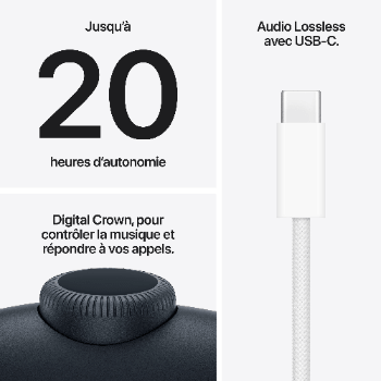 Technologie audioAudio Lossless supporté en filaire via le câble USB-C vers USB-C, Traducteur dynamique conçu par Apple, Audio Spatial Personnalisé