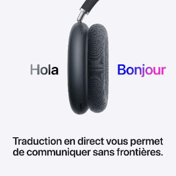 2. La Traduction en direct avec les AirPods fonctionne sur les AirPods Max 2 dotés du dernier programme interne et jumelés à un iPhone exécutant iOS 26.4 (ou version ultérieure) sur lequel Apple Intelligence est activée. Disponible en version bêta. La disponibilité des fonctionnalités peut varier en fonction des régions et des langues. Pour plus d’informations, consultez la page apple.com/fr/ios/feature-availability.