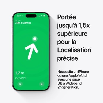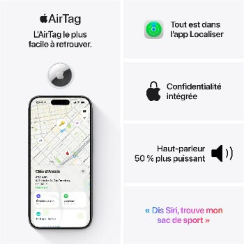Disponibilité limitéeL’AirTag (2ème génération) est maintenant doté de son haut-parleur le plus puissant à ce jour et d’une portée de Localisation précise optimisée pour vous aider à retrouver vos objets plus facilement que jamais. Accrochez-en un à vos clés. Glissez-en un autre dans votre sac. Et retrouvez toutes vos affaires dans l’app Localiser. Inclus 4 AirTags.