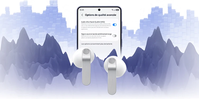 3. L’audio Ultra Haute Qualité (UHQ) jusqu’à 24 bits/96 kHz est disponible sur la série Galaxy S26, S25, S24, S23, les modèles Z Fold7, Z Flip7, Z Fold6, Z Flip6, Z Fold5, Z Flip5, et les séries Tab S11, S10, S9 avec One UI 6.1.1 ou supérieur. D’autres appareils pourraient être pris en charge à l’avenir.