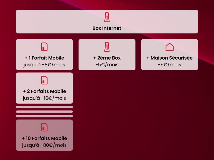 En dessous à gauche une colonne de blocs successifs. Dans le premier bloc une icône rouge d’une carte SIM stylisée au dessus de l’inscription “+ 1 Forfait Mobile jusqu’à -8€/mois”. Dans le bloc du dessous une icône rouge d’une carte SIM stylisée au dessus de l’inscription “+ 2 Forfaits Mobile jusqu’à -16€/mois”. En dessous de ce bloc, 3 blocs plus petits pour illustrer les forfaits suivants. Tout en bas de la colonne un bloc avec une icône rouge d’une carte SIM stylisée au dessus de l’inscription “+ 10 Forfaits Mobile jusqu’à -80€/mois”.