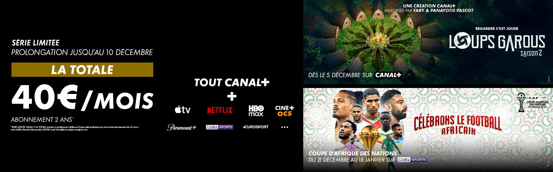 (1) Offre valable en France métropolitaine du 20 novembre au 03 décembre 2025 pour tout nouvel abonnement (toute personne non abonnée aux offres CANAL+ au cours du mois dernier) pour 24 mois (+ le mois en cours facturé au prorata temporis – pour toute souscription via boutique.canalplus.com, le paiement de la première mensualité s’effectue dans son intégralité) à SERIE LIMITEE CANAL+ LA TOTALE (CANAL+ & CANAL+SPORT 4 ECRANS abonnement 24 mois avec CANAL+ A LA DEMANDE et Apple TV+ et CINE SERIES EXTRA abonnement mensuel) par ADSL/Fibre, câble via SFR THD/Numéricâble au tarif de 40€/mois pendant 24 mois pour un abonnement 24 mois. Sous réserve d’être éligible aux offres de CANAL+ FRANCE avec votre opérateur. Pour tout abonnement par le réseau Internet : sous réserve de disposer du matériel compatible et d’une connexion Internet haut débit. A l’issue des 24 mois (+ le mois en cours), votre contrat d’abonnement à LA SERIE LIMITEE CANAL+ LA TOTALE (CANAL+& CANAL+SPORT 4 ECRANS avec CANAL+ A LA DEMANDE et Apple TV+ et CINE SERIES EXTRA) est renouvelé pour des durées successives de 12 mois au tarif en vigueur à la date de la reconduction de votre contrat (à titre indicatif au 20/11/2025 pour un abonnement 12 mois : 40€/mois), sauf résiliation. Les tarifs d’abonnement promotionnels et hors promotion ne comprennent pas les coûts liés aux offres Internet et TV numérique de votre opérateur SFR.